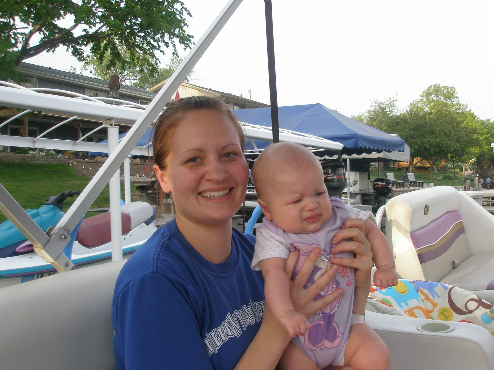Rhea got her first boat ride(s) this last week!! We've gone out in the evening close to her last feeding and bedtime so it's been kinda iffy for her. She likes to sit by herself like a big girl for the trip down the canal. [I turn her away from the wind once we get out on the lake] Yes, we do have a teeny life jacket for her, graciously borrowed from the neighbors. Daddy seems to think she'll ride the jet ski this summer too but mom is the kill-joy and says no way. She does like the water during bath time though, she is starting to figure out how to splash... so cute. Grammy Kay gave us a blow up ducky tub that may double for a swimming pool once she can sit up on her own. It's going to be such a fun summer!!